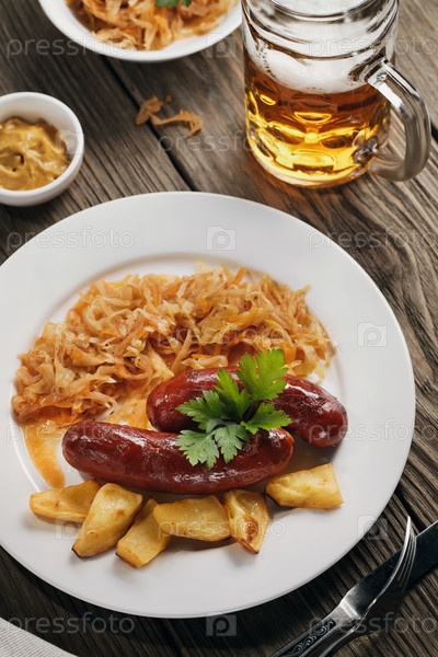 Запеченные баварские колбаски с тушеной капустой и стакан пива