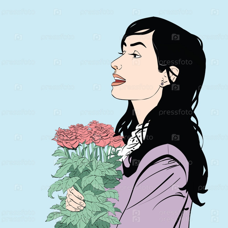 Красивая брюнетка с букетом цветов роз