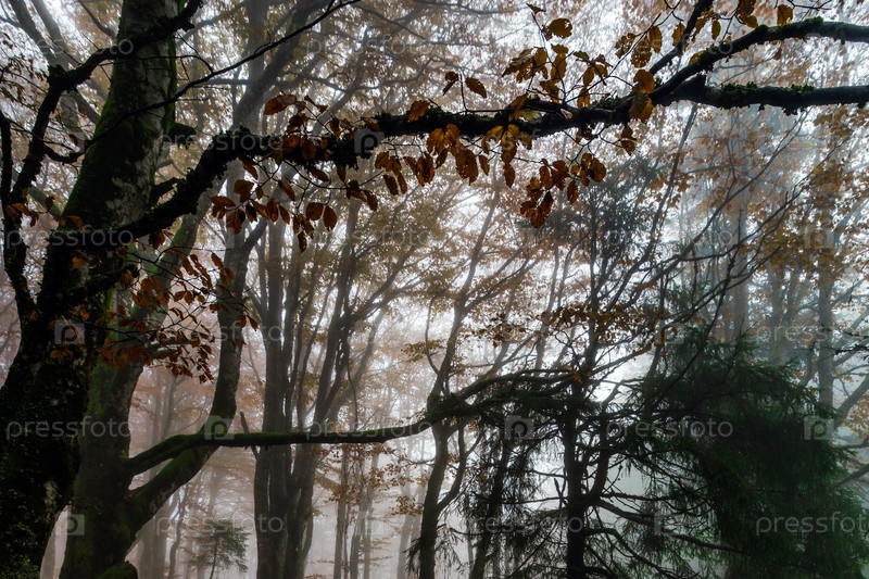 Красивый осенний лес с туманом