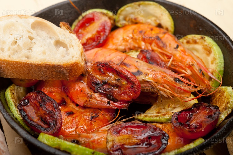 Жареные креветки с кабачками и помидорами
