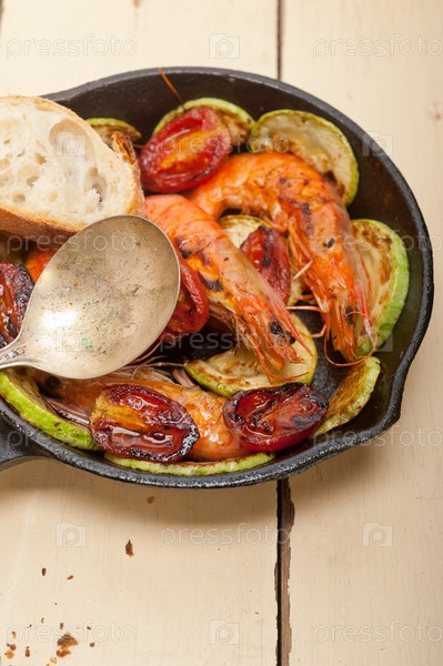 Жареные креветки с кабачками и помидорами