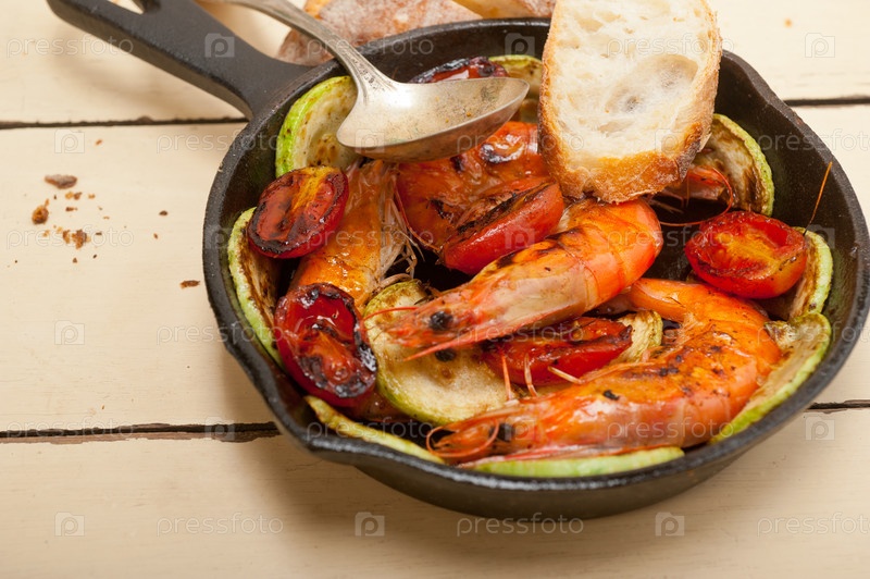 Жареные креветки с кабачками и помидорами