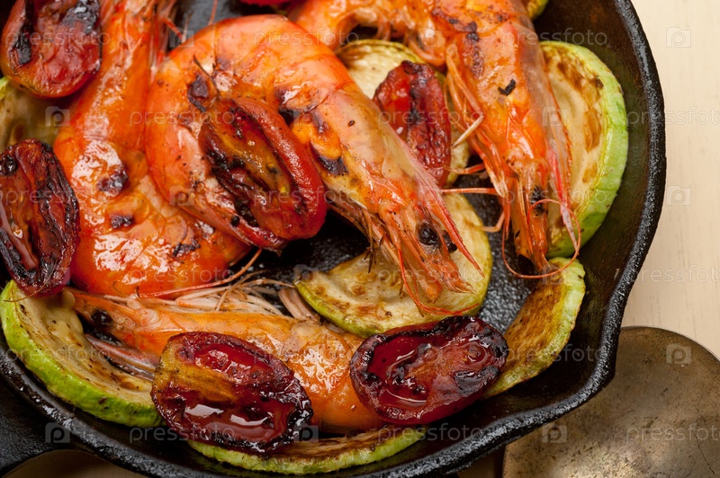 Жареные креветки с кабачками и помидорами