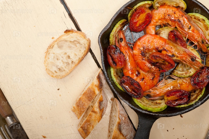 Жареные креветки с кабачками и помидорами