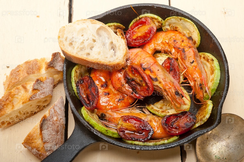 Жареные креветки с кабачками и помидорами