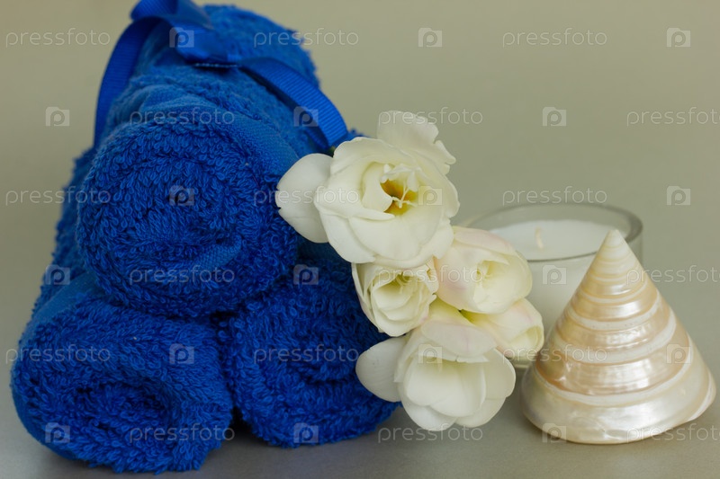 Синие полотенца, цветы и свеча крупным планом