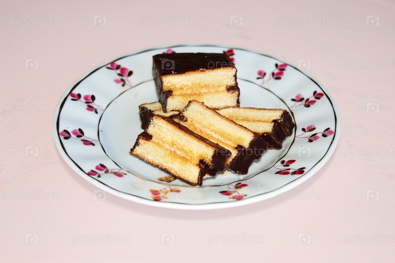 Шоколадный торт в тарелке на фоне розовой скатерти