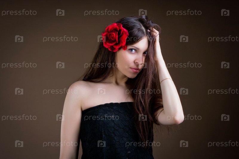 Брюнетка с красным цветком в волосах на коричневом фоне