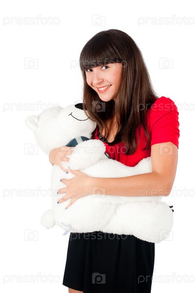 Молодая брюнетка с белым плюшевым медведем на белом фоне