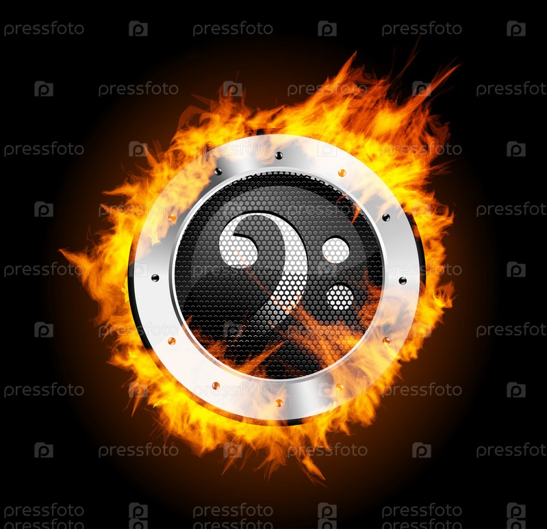 Динамик в огне на черном фоне. Векторная иллюстрация