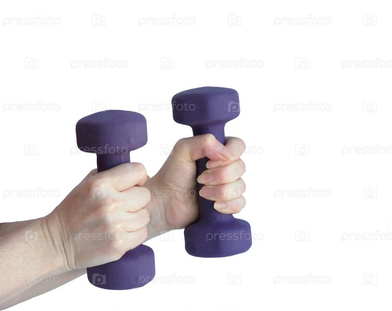 Фиолетовые гантели в женских руках на белом фоне