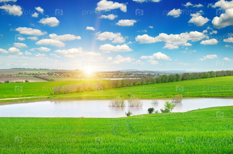 Зеленое поле, озеро и восход солнца