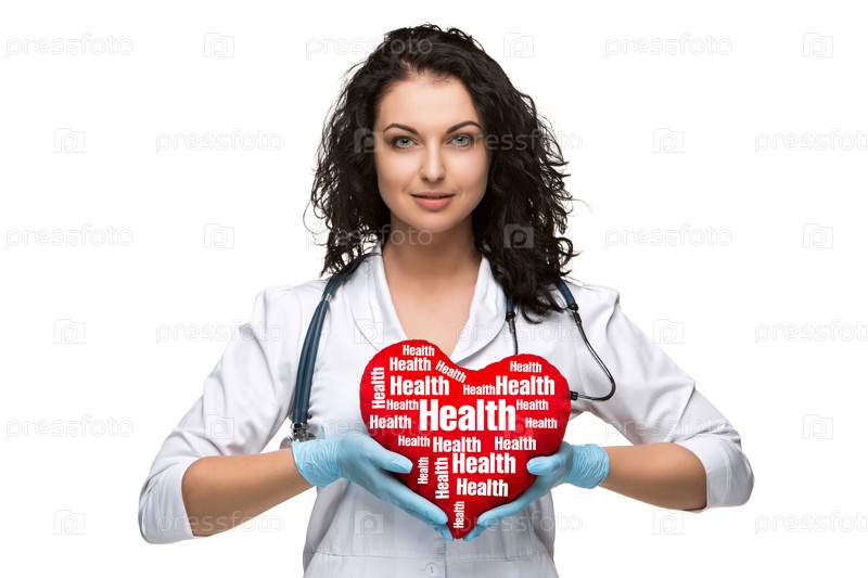 Красивая женщина-врач держит красное сердце