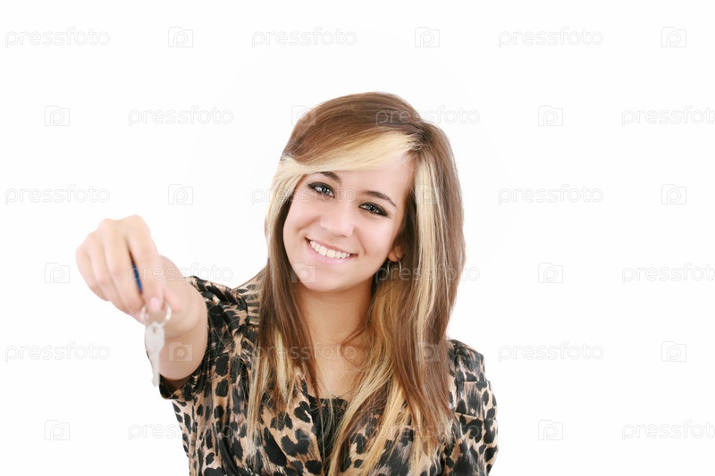 Улыбающаяся женщина дает ключ от дома. Изолирована на белом фоне