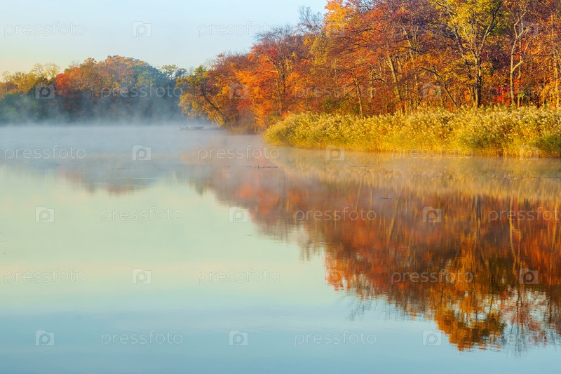 Туман над рекой в лесу осенью