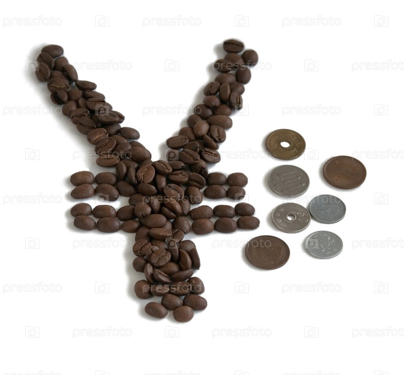 Символ иены, сложенный из кофейных зерен, и японские монеты разного достоинства на белом фоне