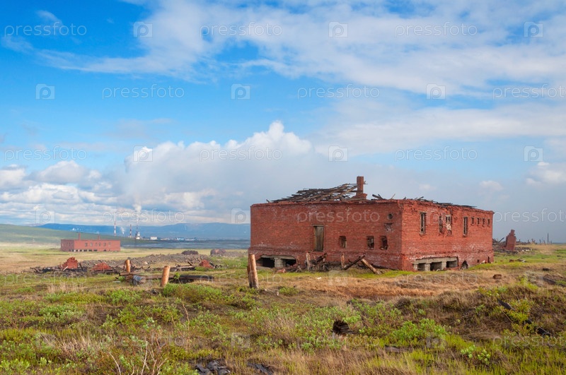 Два заброшенных кирпичных одноэтажных здания в тундре