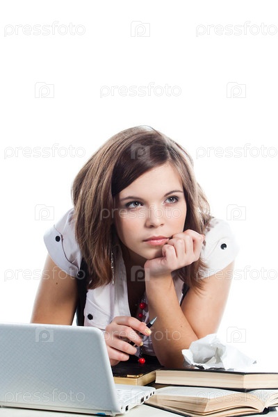 Портрет красивой девушки-студентки, которая готовится к экзаменам