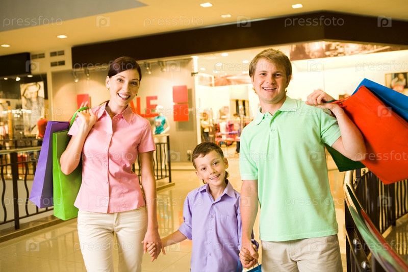 Портрет мужа и жены со своим сыном после покупок