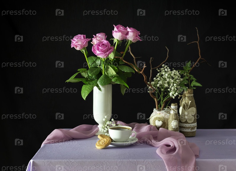 Натюрморт с розовыми розами и кофе