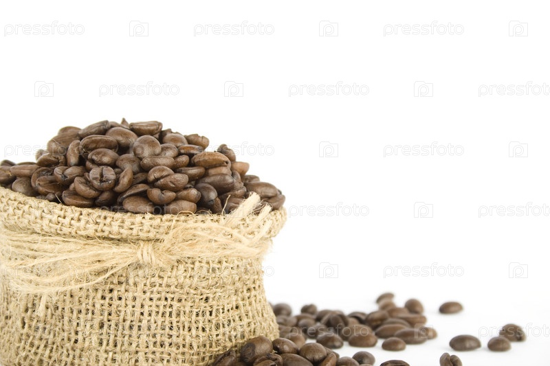 Кофейные зерна в мешке. Изолированы на белом фоне