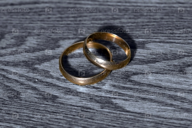 Золотые обручальные кольца на доске темного дерева