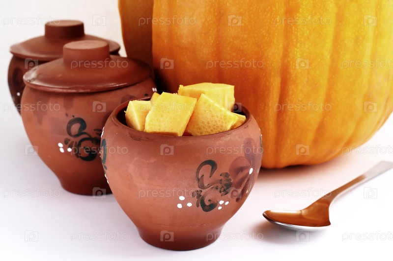 Кусочки тыквы в глиняном горшке