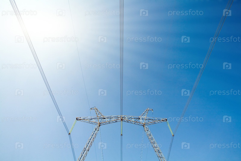 Электропередачи высокого напряжения на фоне голубого безоблачного неба