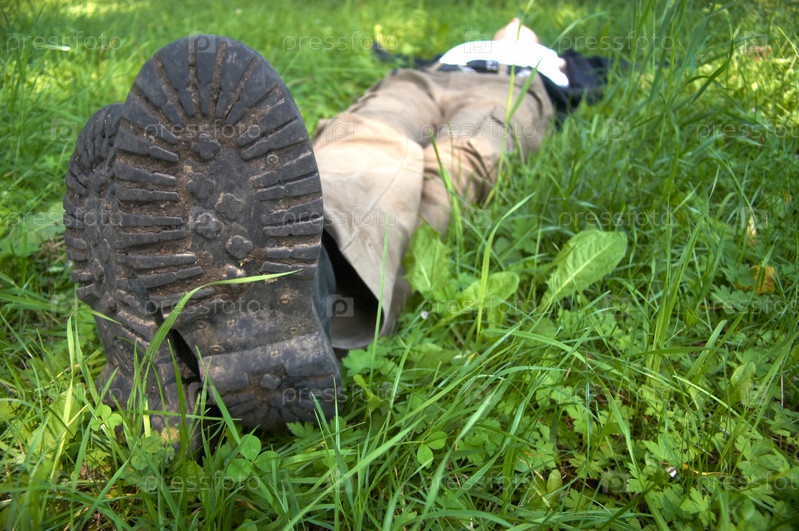 Турист отдыхает, лежа на траве