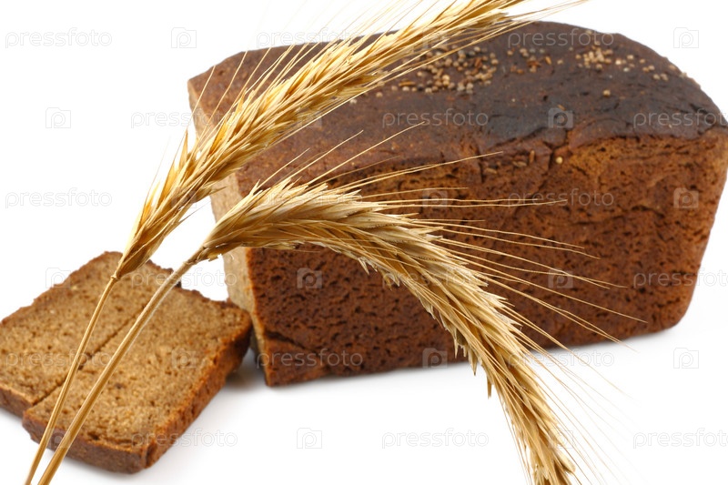 Нарезанный бородинский хлеб и пшеница крупным планом на белом фоне