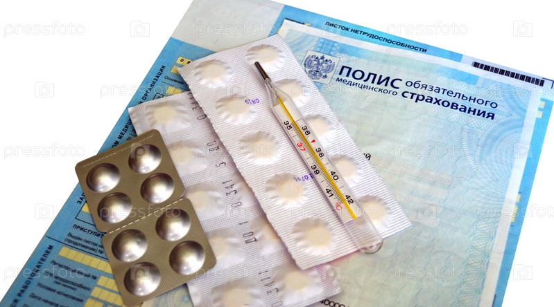термометр и таблетки на фоне страхового полиса. термометр