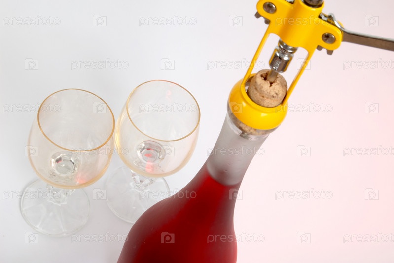 Бутылка красного вина и желтый штопор