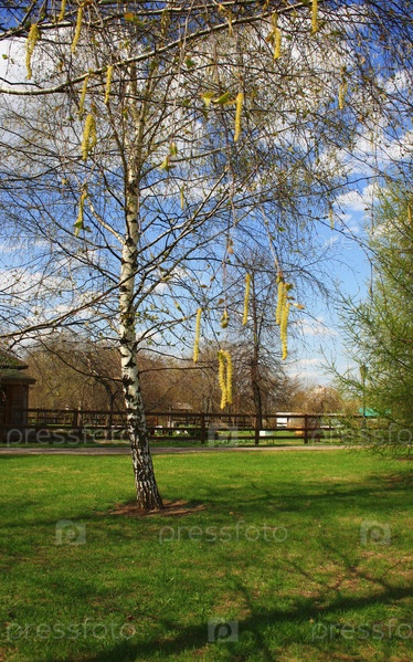 Цветущая береза в весеннем парке