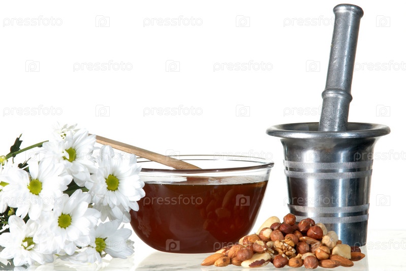 Белые цветы, орехи и ступка