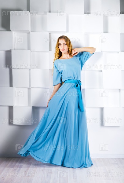 Красивая блондинка в платье у белой стены