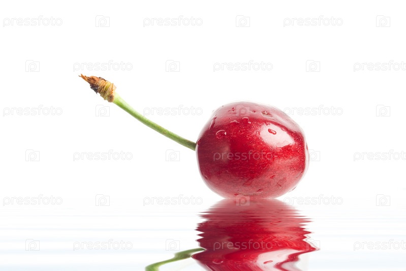 Красная вишня над водой на белом фоне