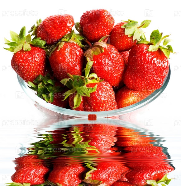 Миска с клубникой над водой на белом фоне