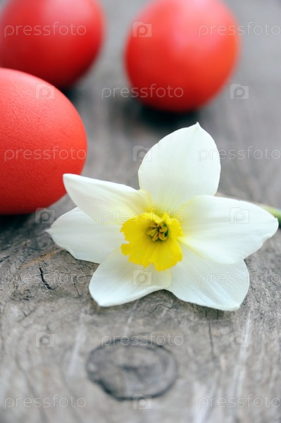 Три красных яйца и весенний цветок на деревянном столе
