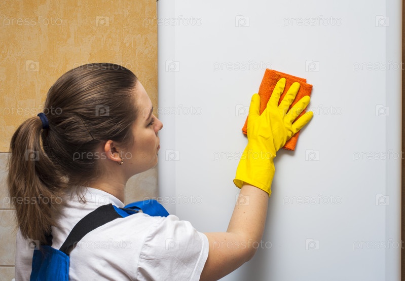 Девушка протирает холодильник