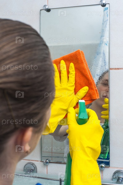 Женщина протирает зеркало