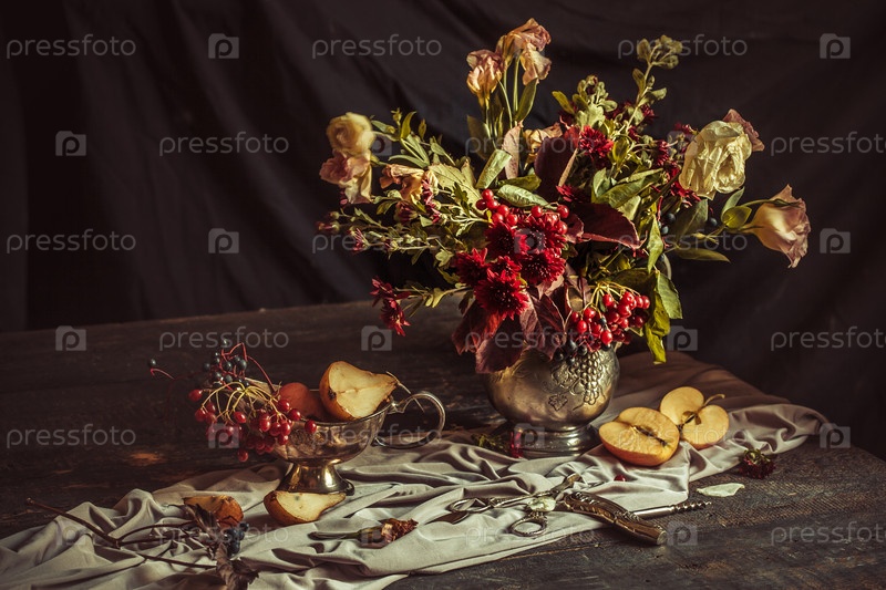 Натюрморт с яблоками и осенние цветы