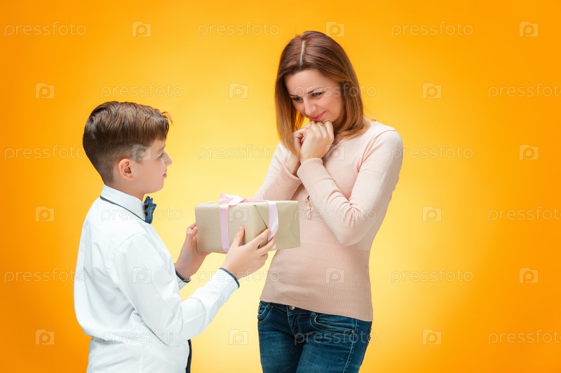 Сын дарит подарок маме