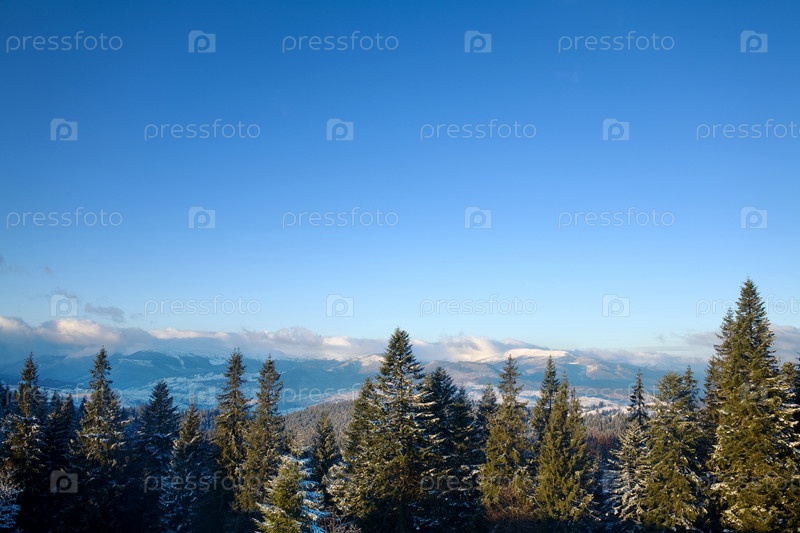 Зимние горы, покрытые хвойным лесом