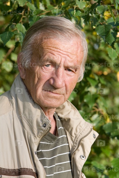 Портрет седой пожилой мужчины в бежевом куртке в деревне на природе