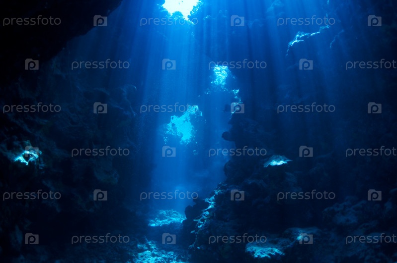 Подводный ландшафт. пещера в коралловом рифе освещена солнечными лучами