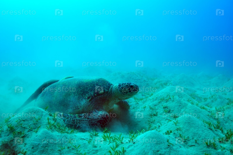 Морская зеленая черепаха и две рыбки-сосы подводный вид. Красное море, Египет