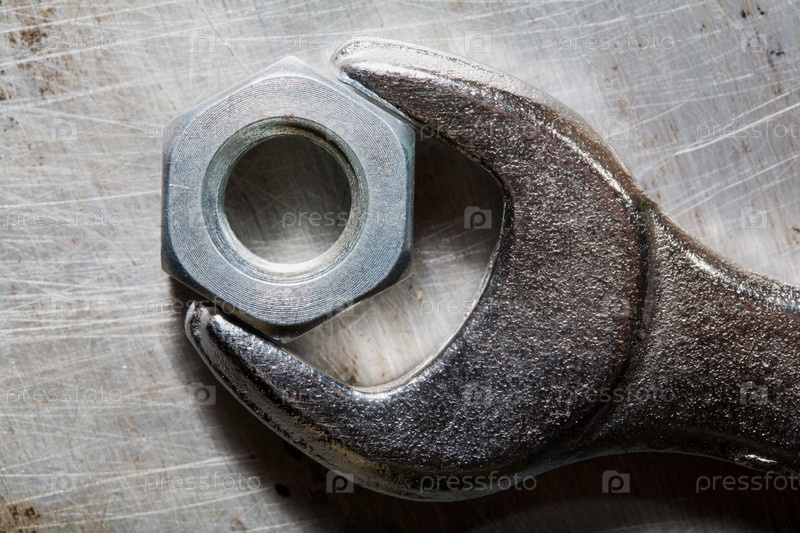 Гайка и ключ на поцарапанном ржавом металле