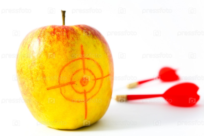 Дротики и яблоко на белом фоне