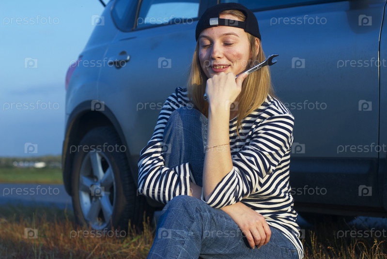 Молодая блондинка сидит у сломанной машины