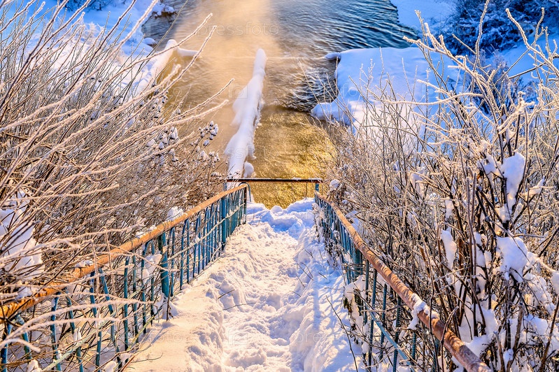 Зимний солнечный пейзаж с рекой